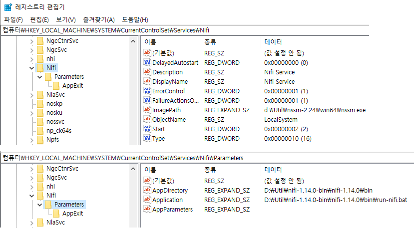 6. 서비스 관리자 에서는 nssm.exe를 실행하는것으로 보이지만 [레지스트리 편집기]를 보시면 nssm에 파라메터를 등록하여 nifi를 실행하고 있는것을 확인할 수 있습니다.